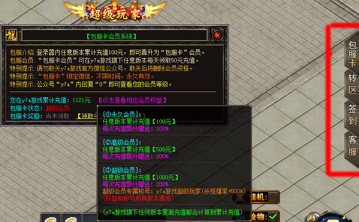 答:Y7A游戏旗下任意版本累计充值满100元即可免费自动开通《包服卡》!